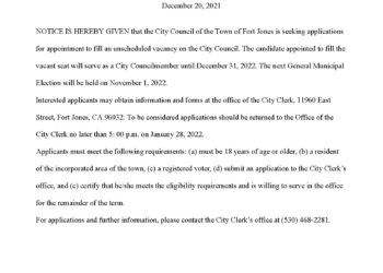 The City Council of the Town of Fort Jones is seeking applications for appointment…