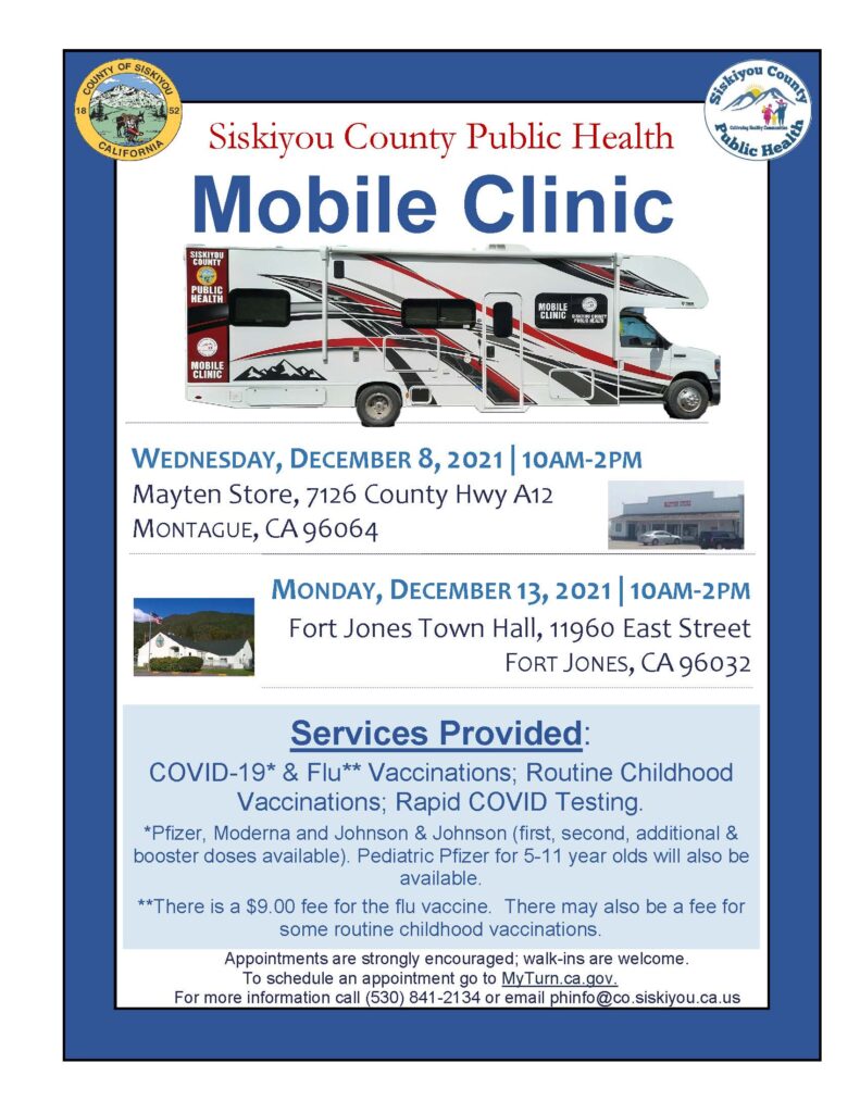 Siskiyou County Public Health will be offering covid-19 and flu vaccinations, routine childhood vaccinations, and rapid covid testing.