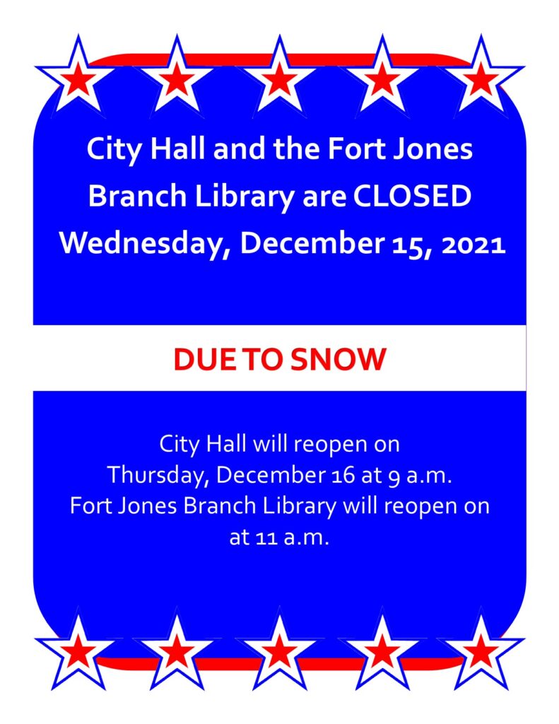 The City Hall office and Fort Jones Branch Library are CLOSED today, 12-15-21, due to weather conditions. We’ll be back in person tomorrow. See you then!