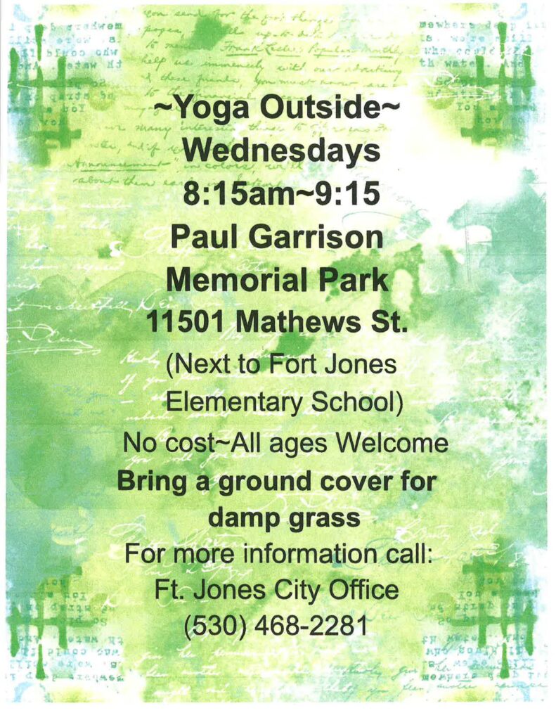 Posted on June 20, 2022 by Celeste McFall Yoga In The Park Join the weekly yoga group on Wednesday mornings at the Little League Park. Bring a towel or mat.