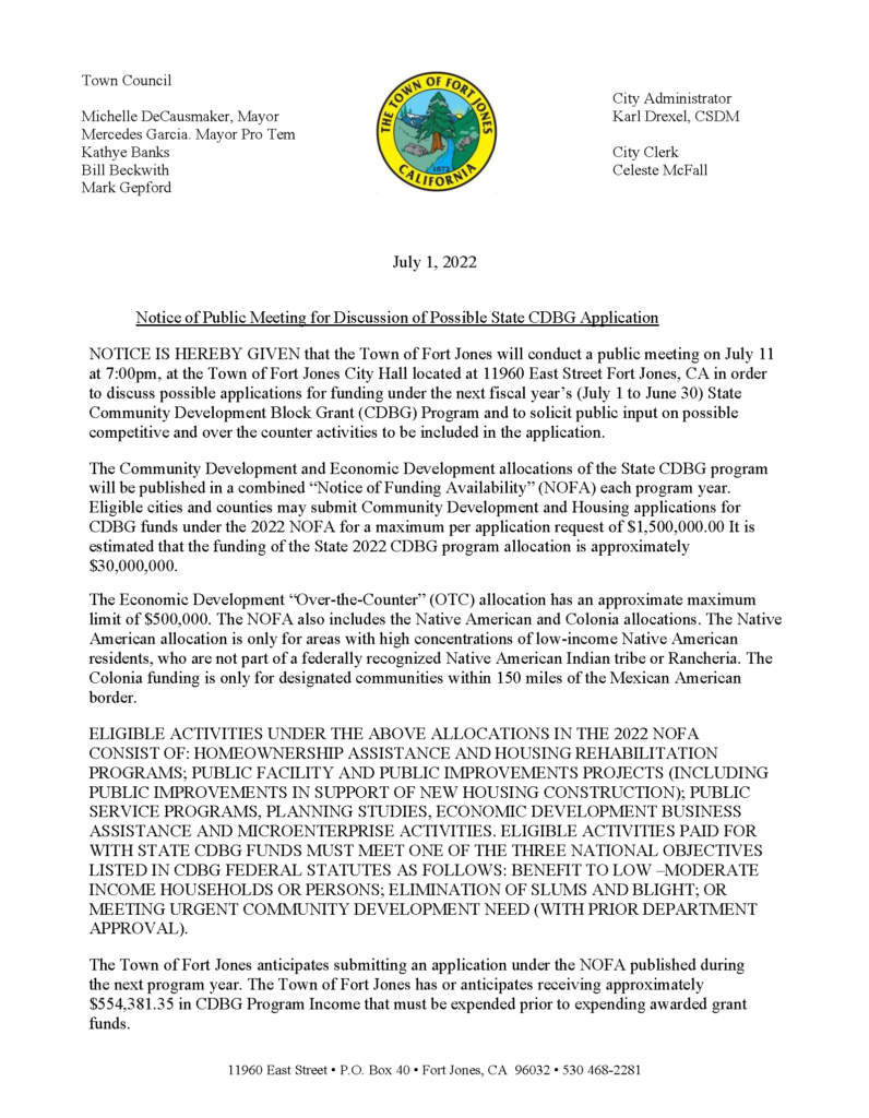 Would you like to see changes in Fort Jones? Let the City Council know how YOU would like to see grant funds spent on Monday, July 11th at the upcoming public hearing. To read the full Notice of Public Meeting, click here.