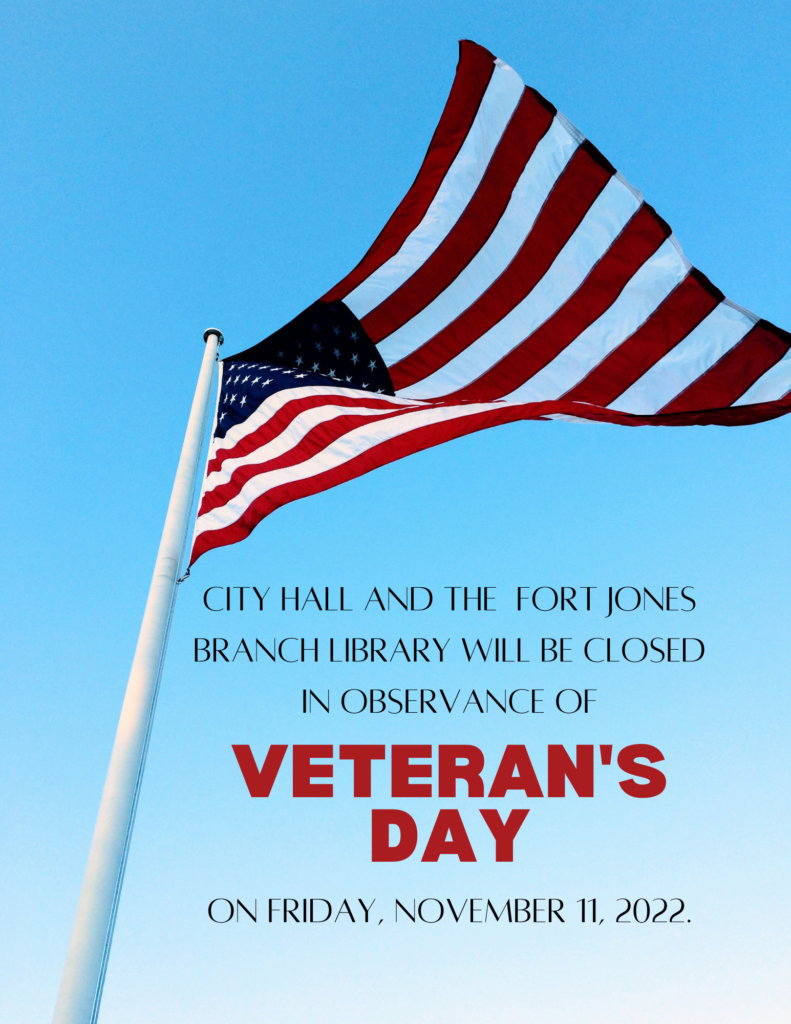 City Hall and the Fort Jones Branch Library will be closed on Friday, November 11, in observance of Veteran’s Day. Normal hours will resume on Monday, November 14.