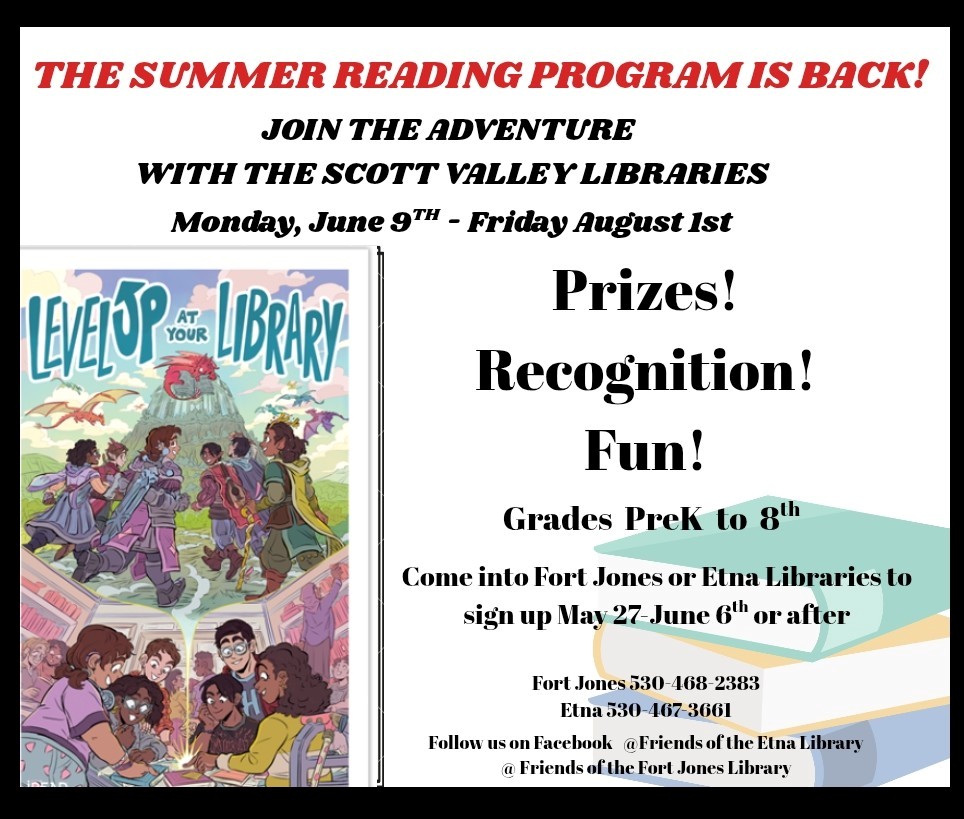 Come sign up for the Summer Reading Program starting on May 27th. Prizes to win and fun to be had for ages pre-k to 8th grade. This program runs from June 9th to August 1st. If you are interested to know more call the Fort Jones Library at (530)468-2382 or the Etna Library at (530)467-3661 or follow our Facebook at @FriendsoftheEtnaLibrary or @FriendsoftheFortJonesLibrary